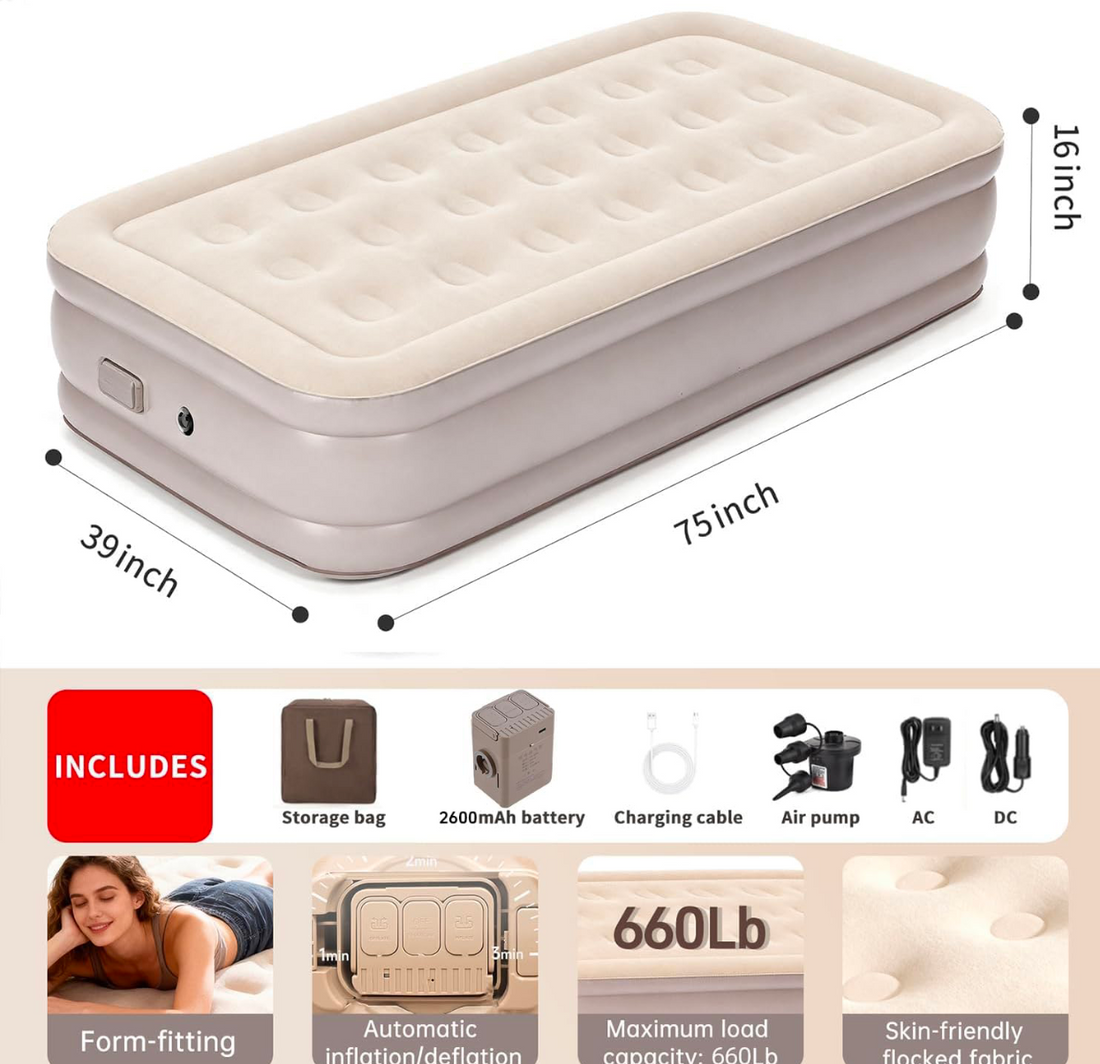 Shivas Twin Air Mattress Built in Pump,Newly Cordless Removable Lithium Battery Pump,Self Inflatable,Camping Mattress,Portable Blow Up Mattress for Camping,Guests and Home